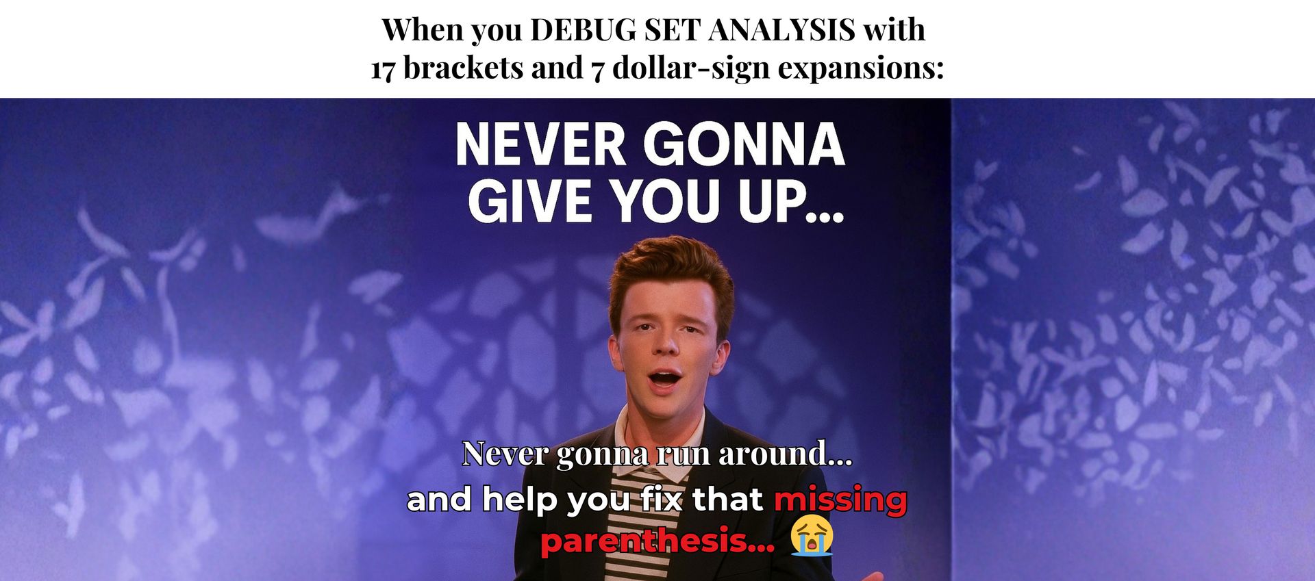 “Never gonna give you up… Never gonna help you fix that broken set analysis.”